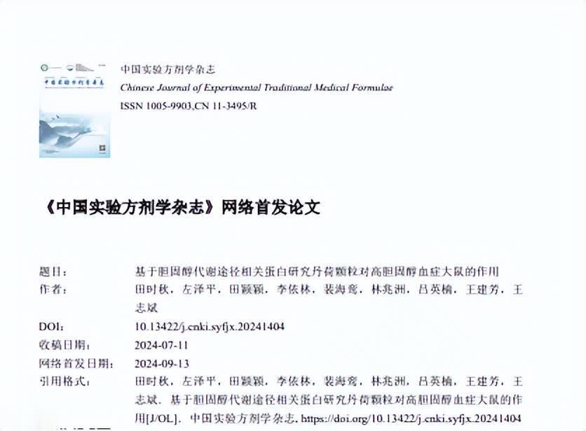 参考资料[1]田时秋,左泽平,田颖颖,等.基于胆固醇代谢途径相关蛋白研究丹荷颗粒对高胆固醇血症大鼠的作用[J/OL].中国实验方剂学杂志,1-16[2024-10-09]